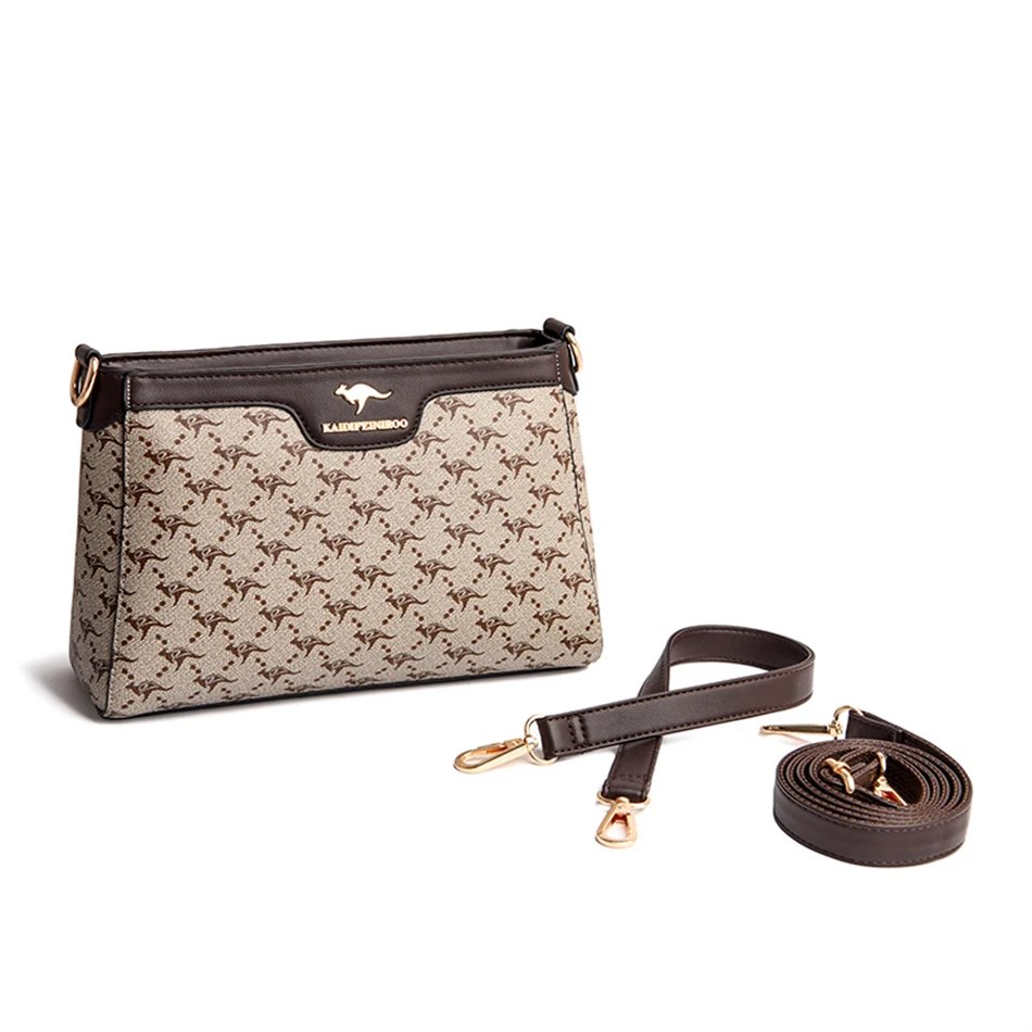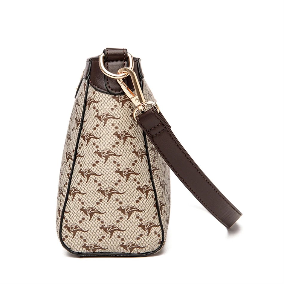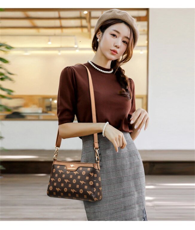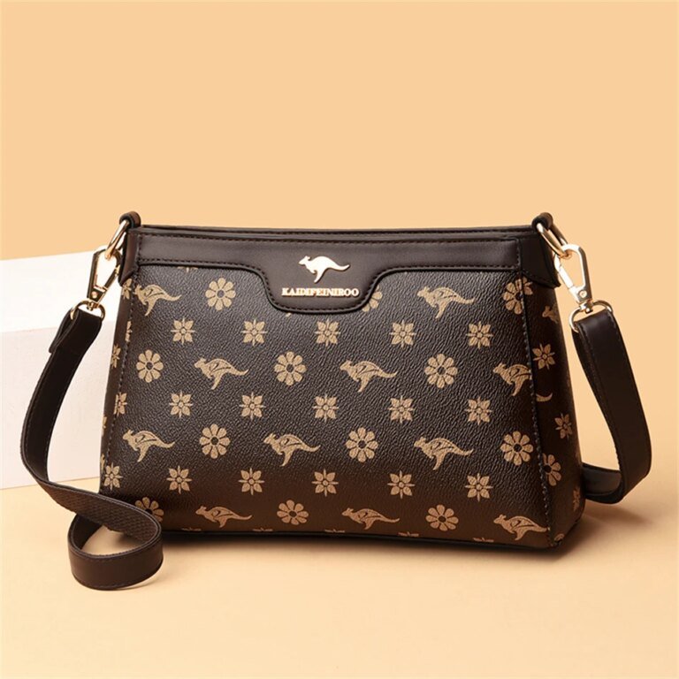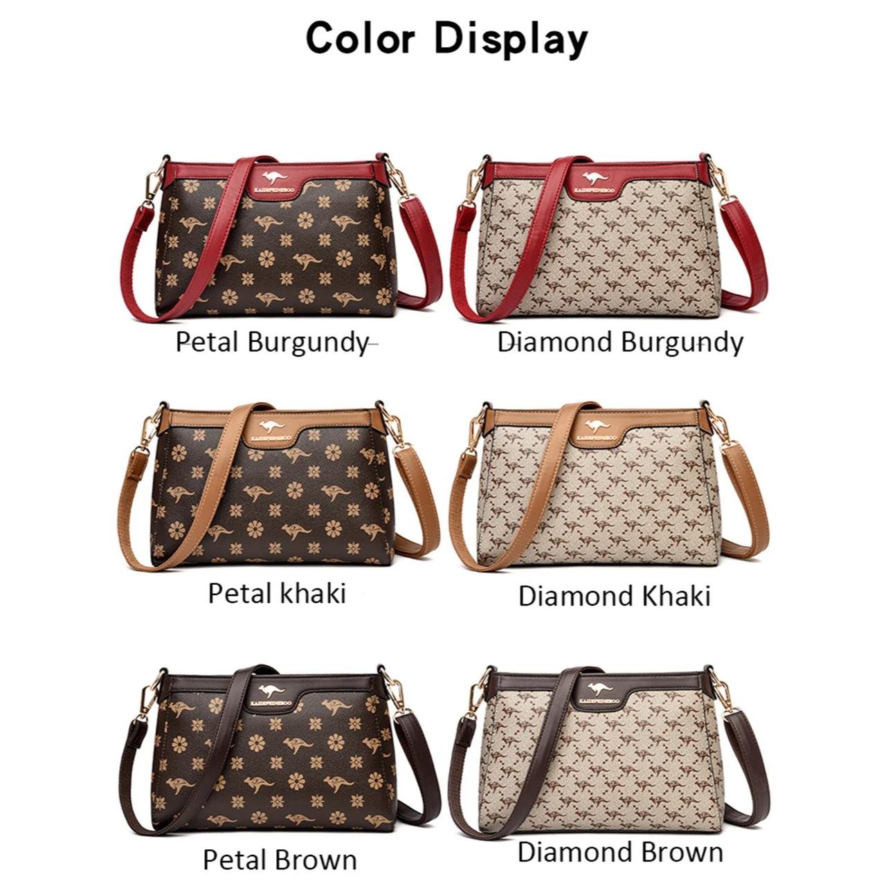กระเป๋าสะพายข้างใบนี้ผลิตจากหนัง PVC คุณภาพสูง พร้อมลายตารางเพชรและลายพิมพ์จิงโจ้และดอกไม้ที่เป็นเอกลักษณ์ ดีไซน์ Flap ที่ทันสมัยและใช้งานง่าย มีขนาด 26.5 x 18 x 9 ซม. ภายในมีช่องซิป ช่องสำหรับโทรศัพท์มือถือ และช่องแบ่งต่างๆ ช่วยให้คุณจัดเก็บสิ่งของได้อย่างเป็นระเบียบเรียบร้อย ตัวกระเป๋าปิดด้วยซิปและสายยูเพื่อความปลอดภัยของสิ่งของ มาพร้อมสายสะพายสองเส้น เพื่อการปรับเปลี่ยนสไตล์การสะพายให้เข้ากับโอกาสต่างๆ กระเป๋าใบนี้เหมาะสำหรับผู้หญิงที่ต้องการกระเป๋าที่ผสมผสานระหว่างแฟชั่น ความสะดวกสบาย และความสง่างาม