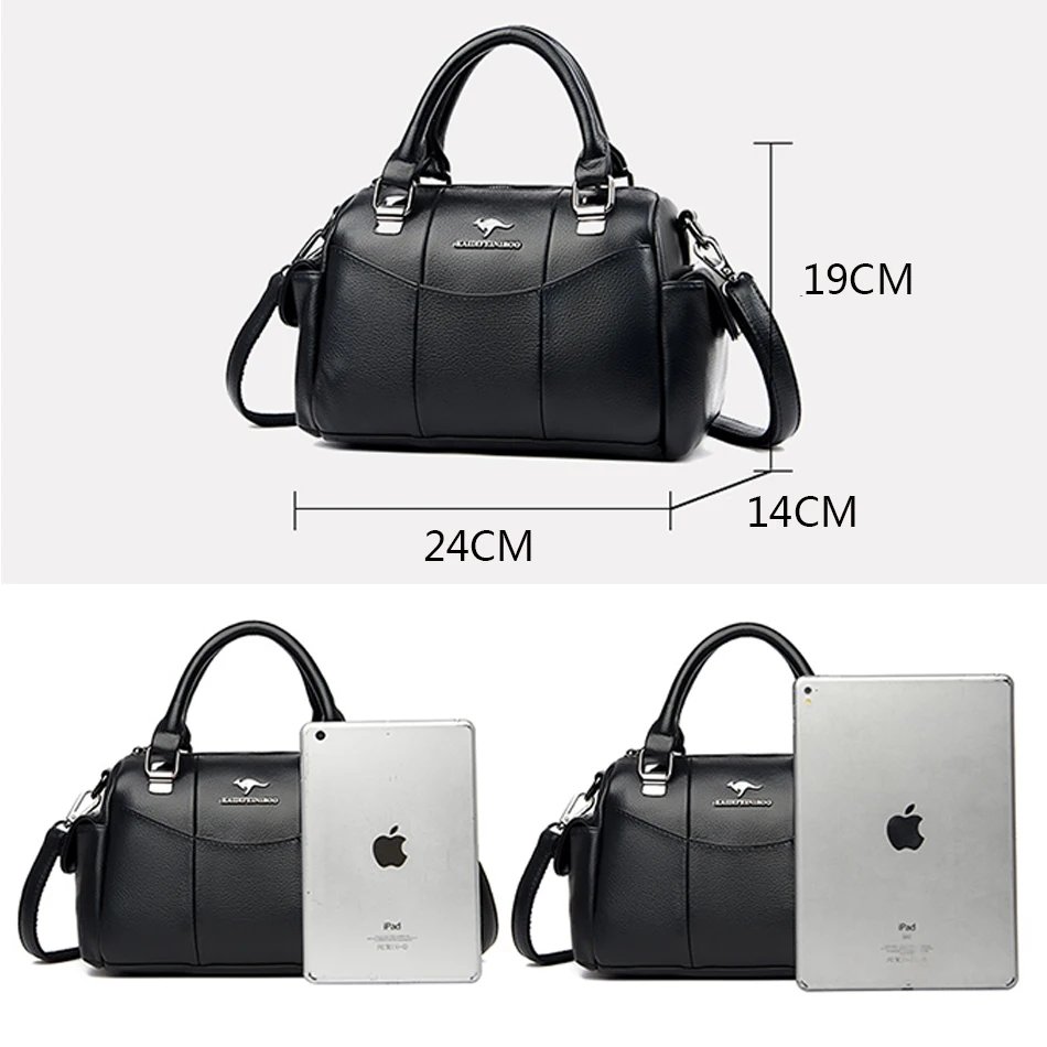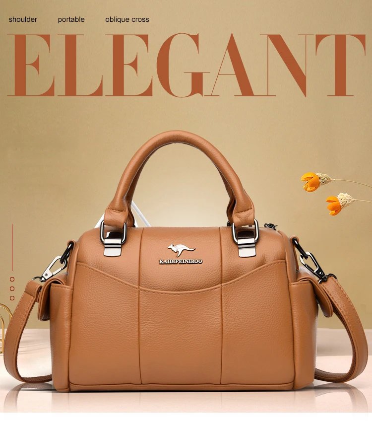 กระเป๋าถือใบนี้ผลิตจากหนัง PU คุณภาพสูง ให้สัมผัสที่นุ่มนวลแต่คงรูปทรงแข็งแรง ดีไซน์ทรง Boston ที่ดูหรูหราและคลาสสิก แต่ยังคงความทันสมัย พร้อมโลโก้จิงโจ้ที่เป็นเอกลักษณ์ ขนาด 24 x 19 x 14 ซม. ภายในมีช่องซิป ช่องสำหรับโทรศัพท์มือถือ และช่องแบ่งต่างๆ ช่วยให้คุณจัดเก็บสิ่งของได้อย่างเป็นระเบียบเรียบร้อย ตัวกระเป๋าปิดด้วยซิปเพื่อความปลอดภัยของสิ่งของ สามารถถือเป็นกระเป๋าถือ หรือสะพายข้างได้ เหมาะสำหรับผู้หญิงที่ต้องการกระเป๋าที่ผสมผสานระหว่างแฟชั่น ความจุ และความสะดวกสบายในการใช้งานทุกวัน